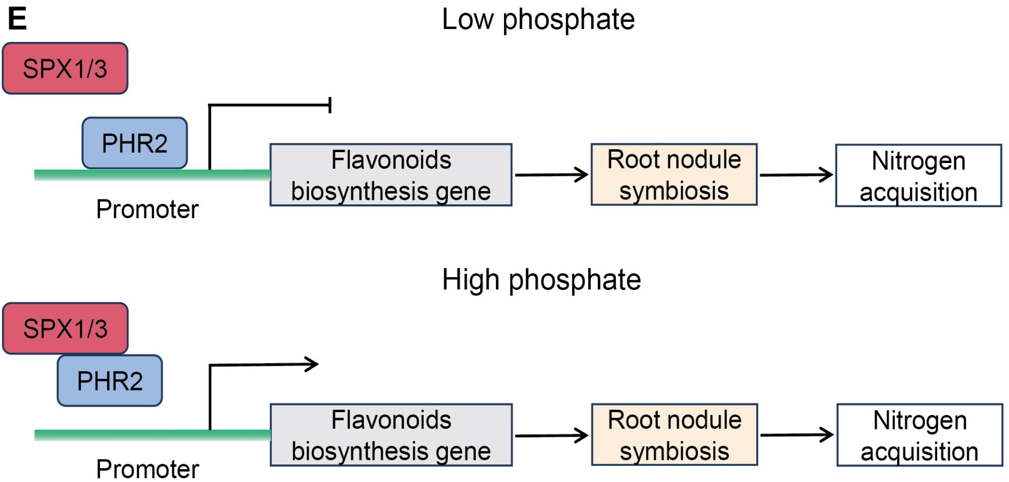 图1. SPX1/3-PHR2根据磷含量控制黄酮类化合物合成,从而调控根瘤共生的模式图