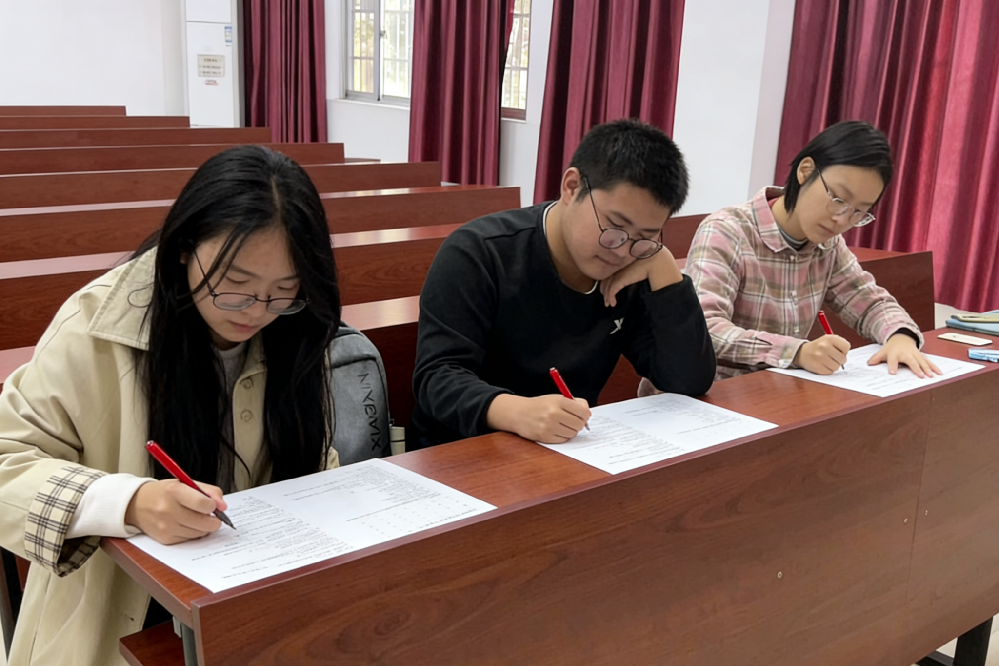 考试筹备阶段,工作人员提前抵达考场,完成场地布置、考生名单核对与试卷分发工作,并有序引导到场同学按指定座位就座。试卷分发完毕后,参赛同学迅速投入答题,考场内秩序井然。考试期间,工作人员全程巡回监考,既密切关注考生答题进度、严格维护考场纪律,也及时为有需求的同学提供协助,保障考试公平有序进行。