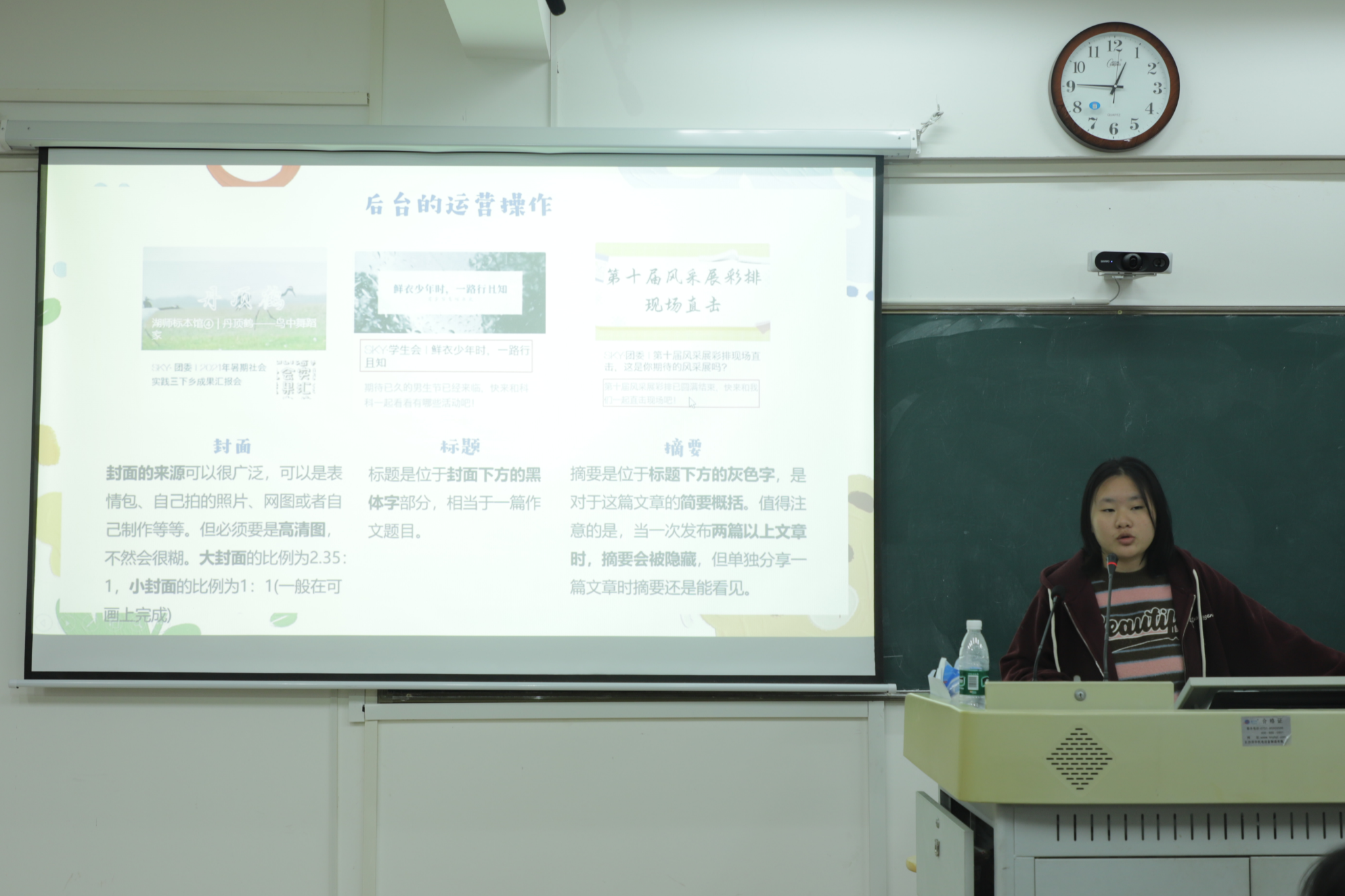 (通讯员 王文馨 郑婷婷)12月5日中午,生命科学学院(以下简称“生科院”)于生科院三号楼B107教室举办“登攀团校—微推制作与公众号运营技能”培训活动。生科院青年传媒中心新媒体部第二负责人夏斌、彭雅婷、周怡担任此次活动主讲人,生科院团委青年发展工作部干事王文馨担任此次活动主持人。生科院2024级、2025级团校学员参加此次活动。