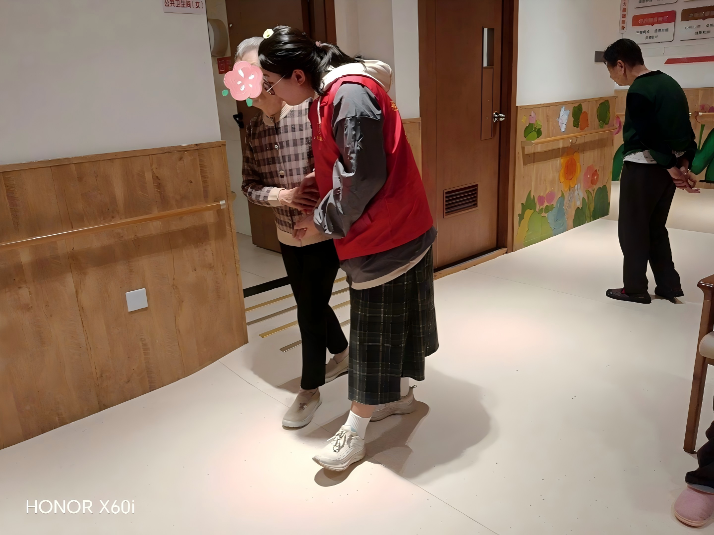 志愿者搀扶老人在室内散步